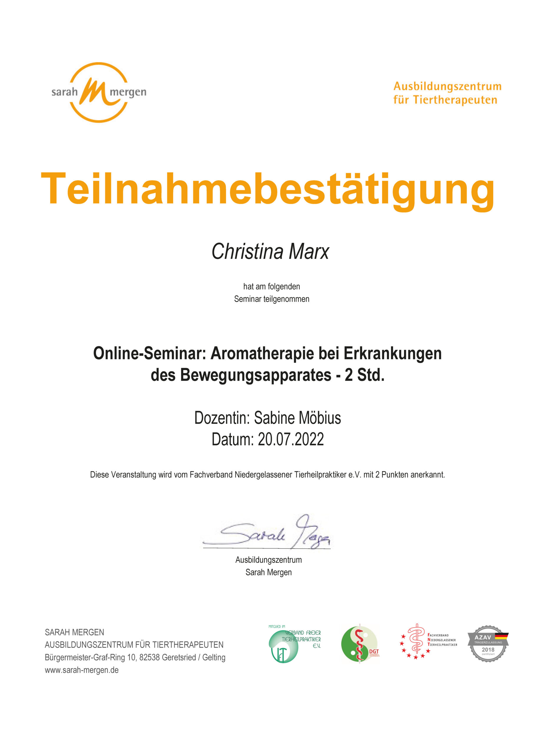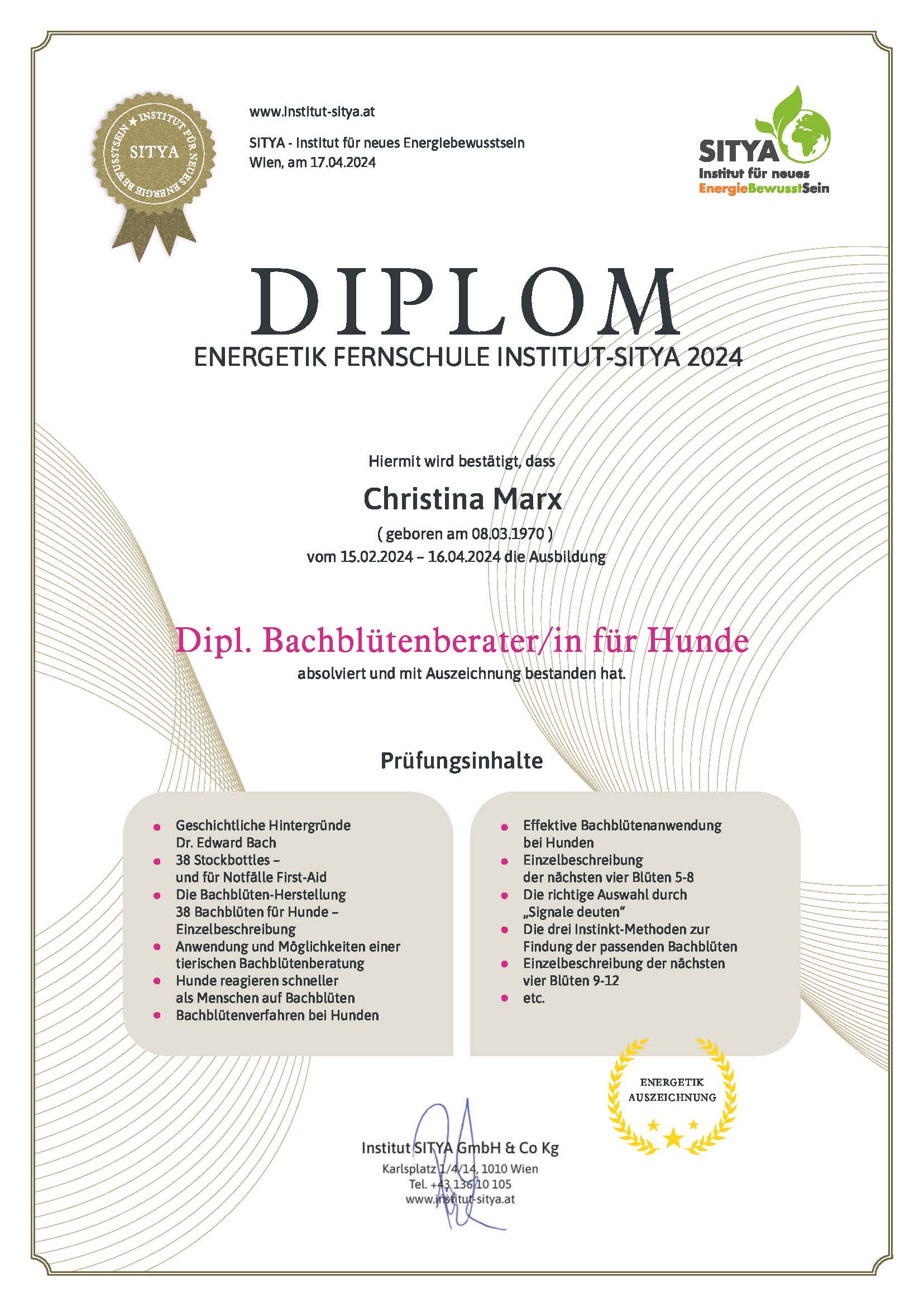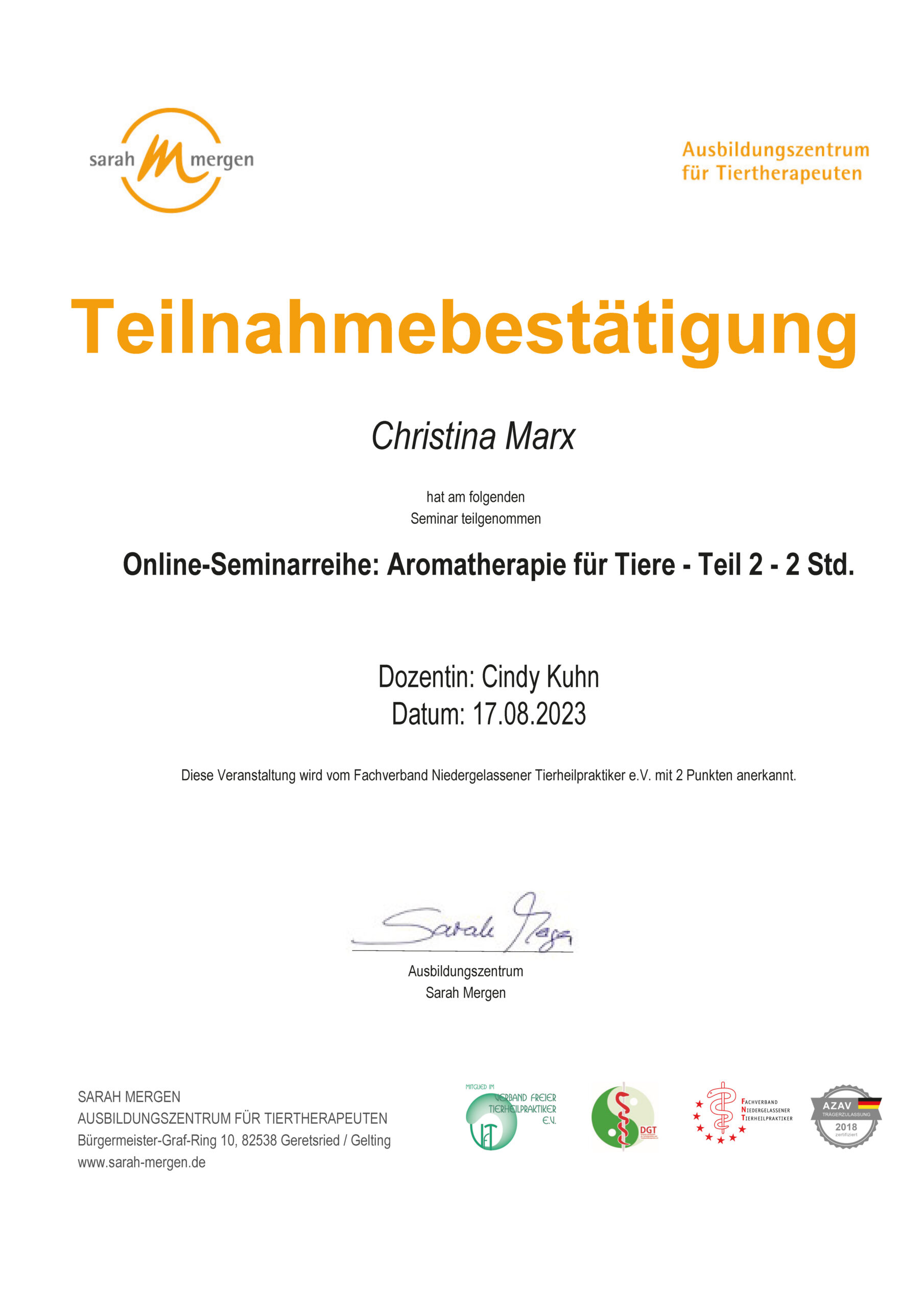 Ätherische Öle für Tiere/Zertifikat der Dozentin Nayana Morag