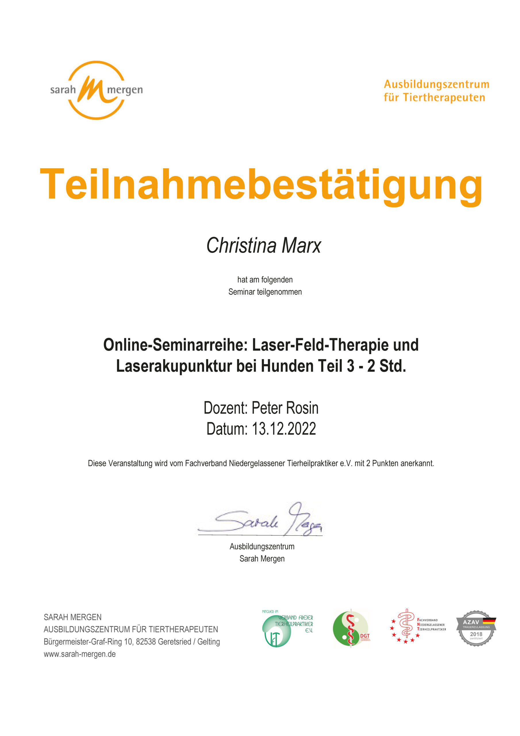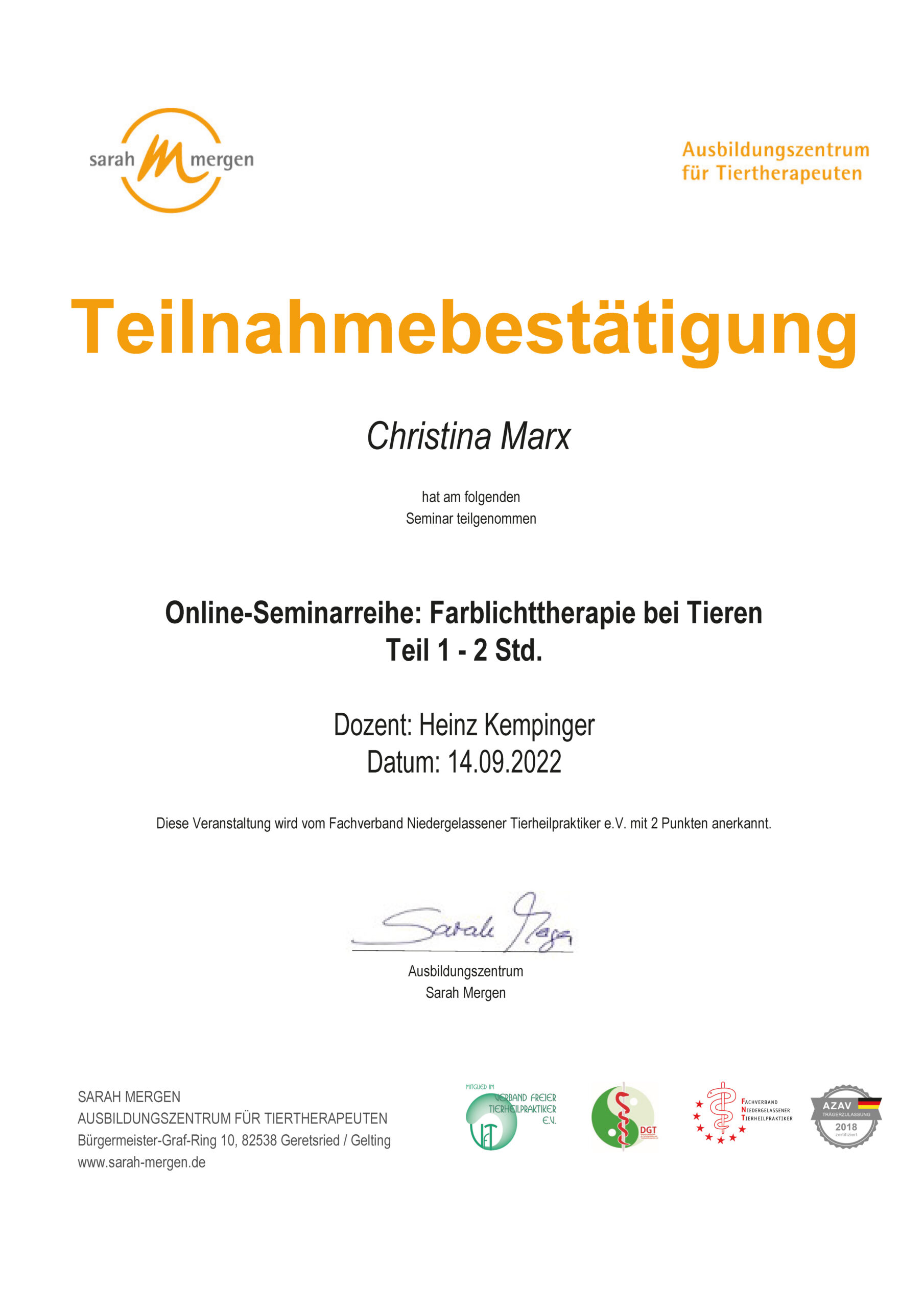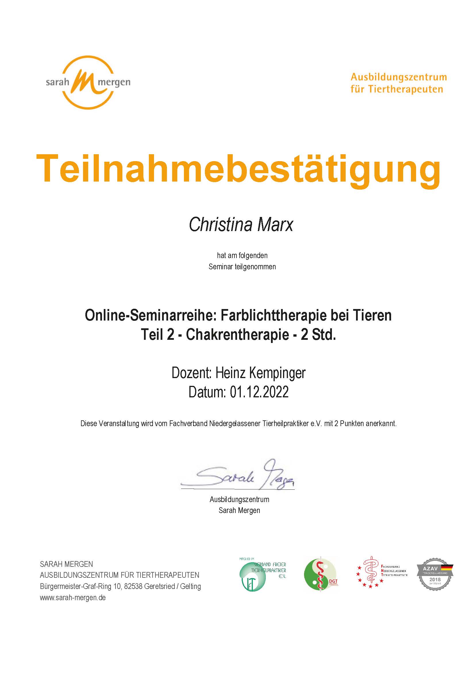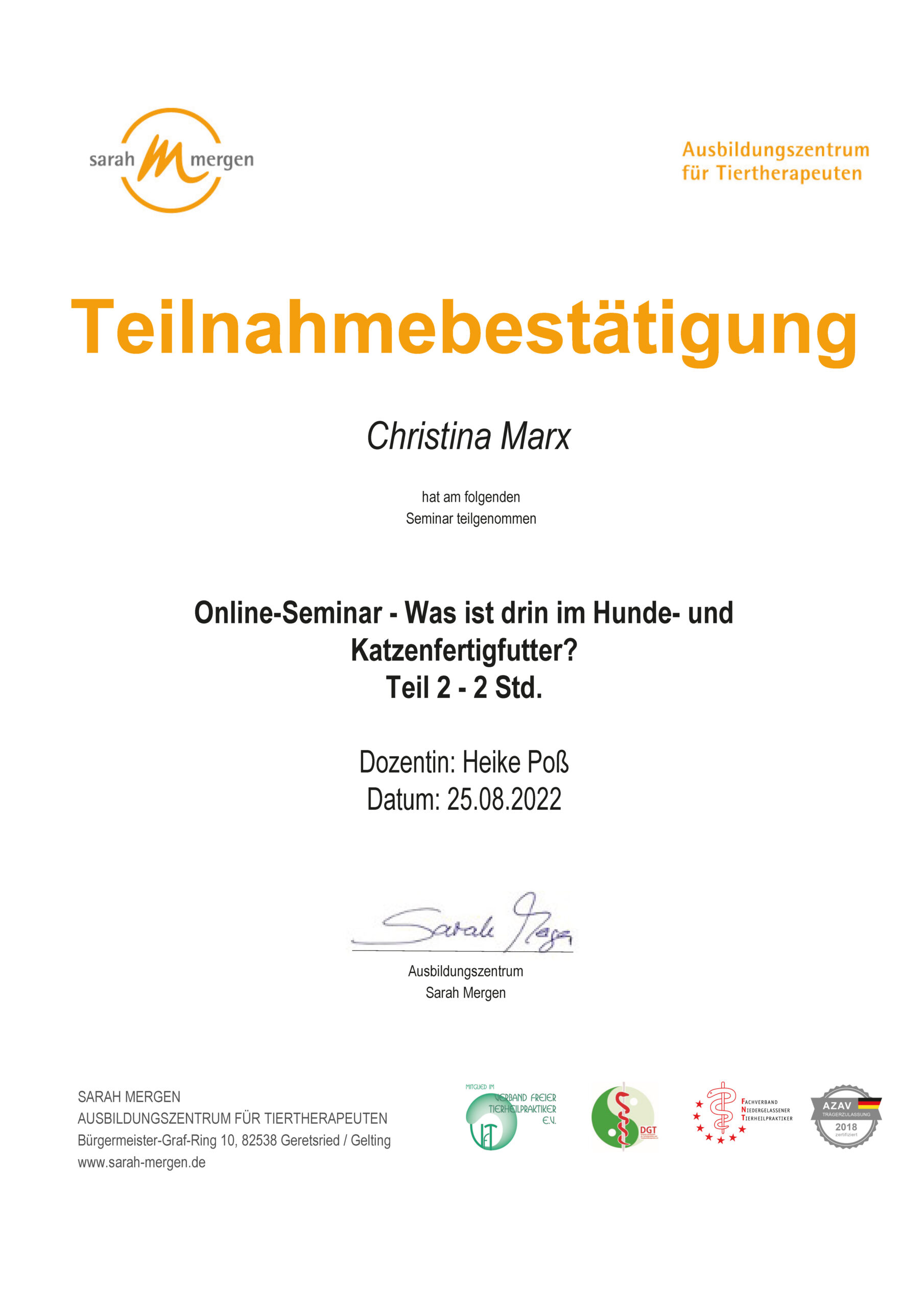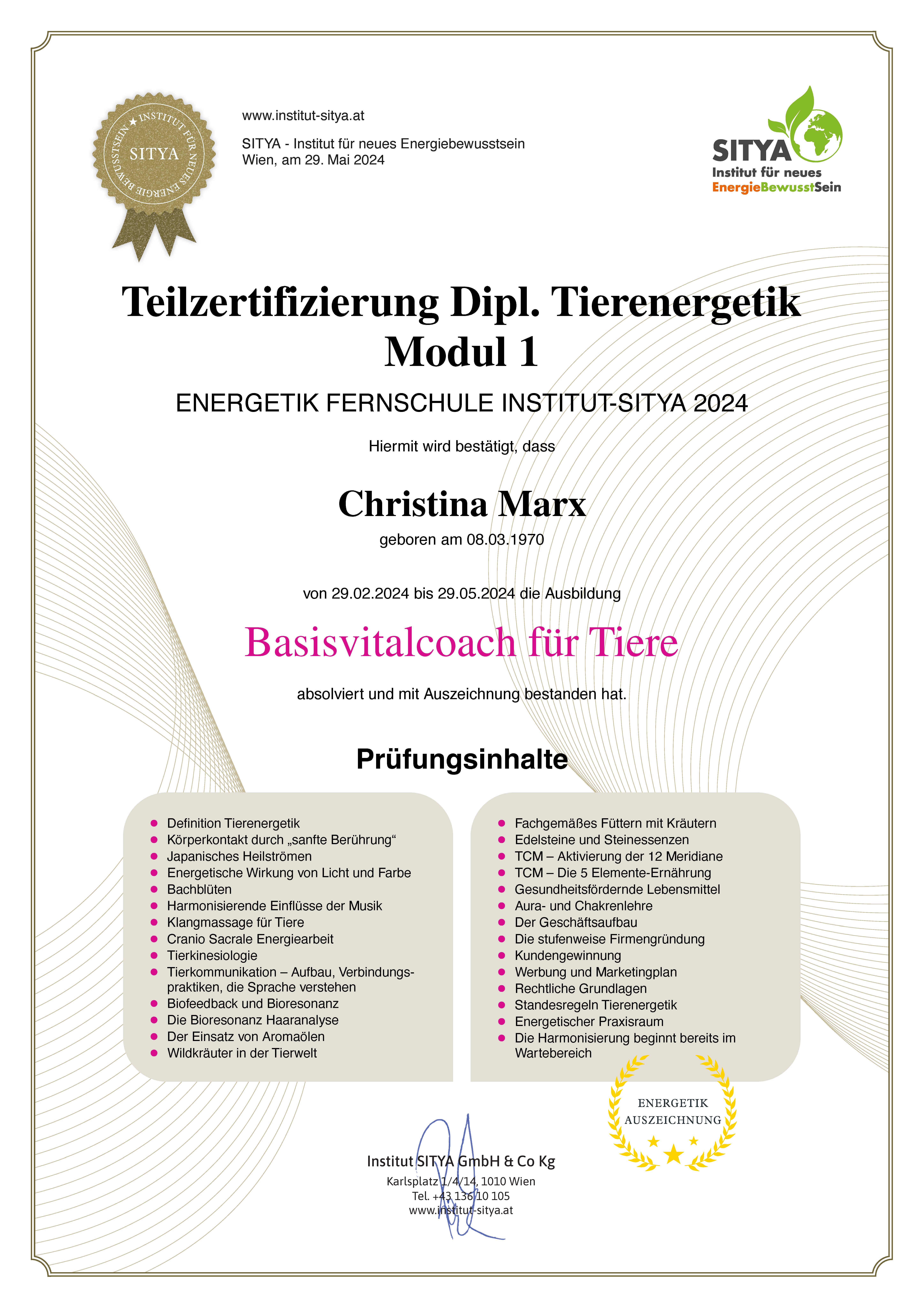 Dipl. Tierenergetik, Teilzertifizierung