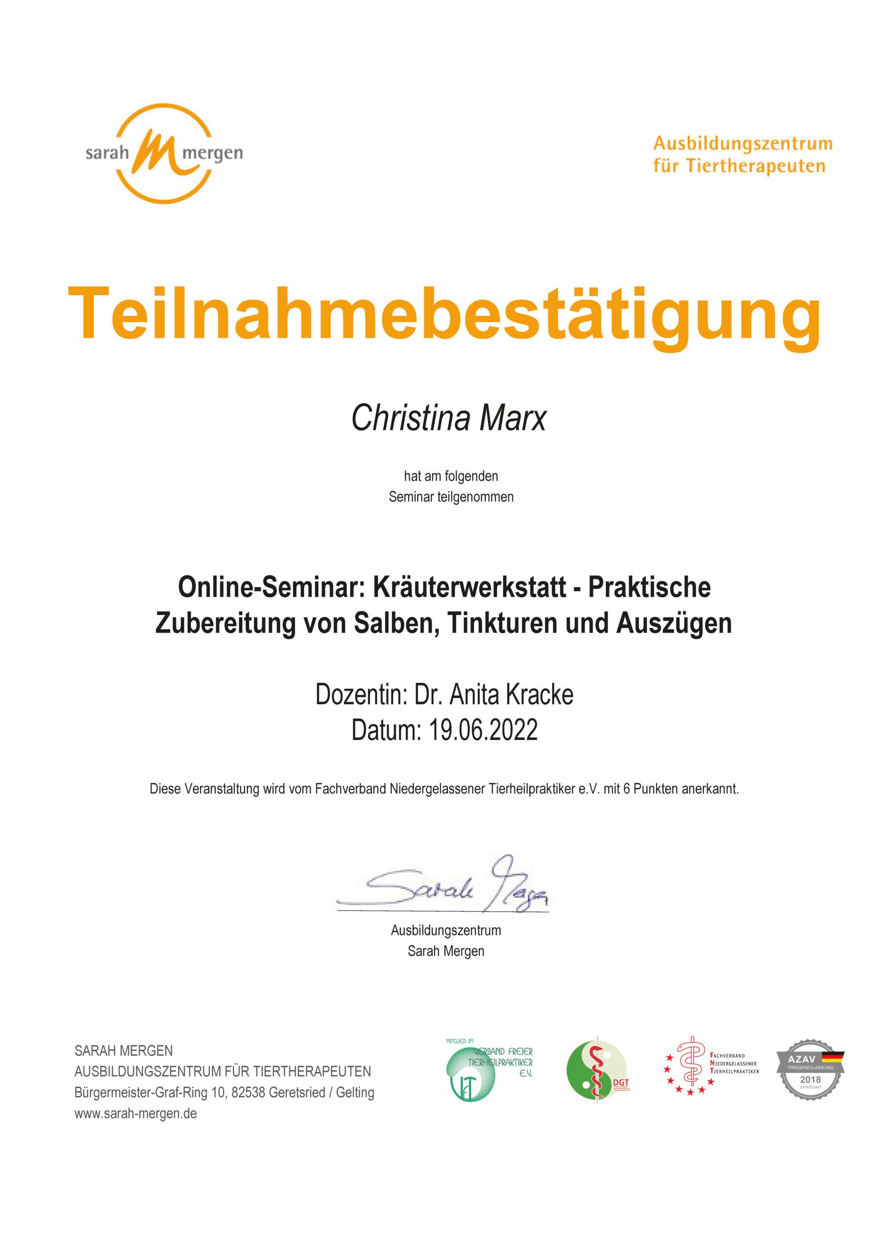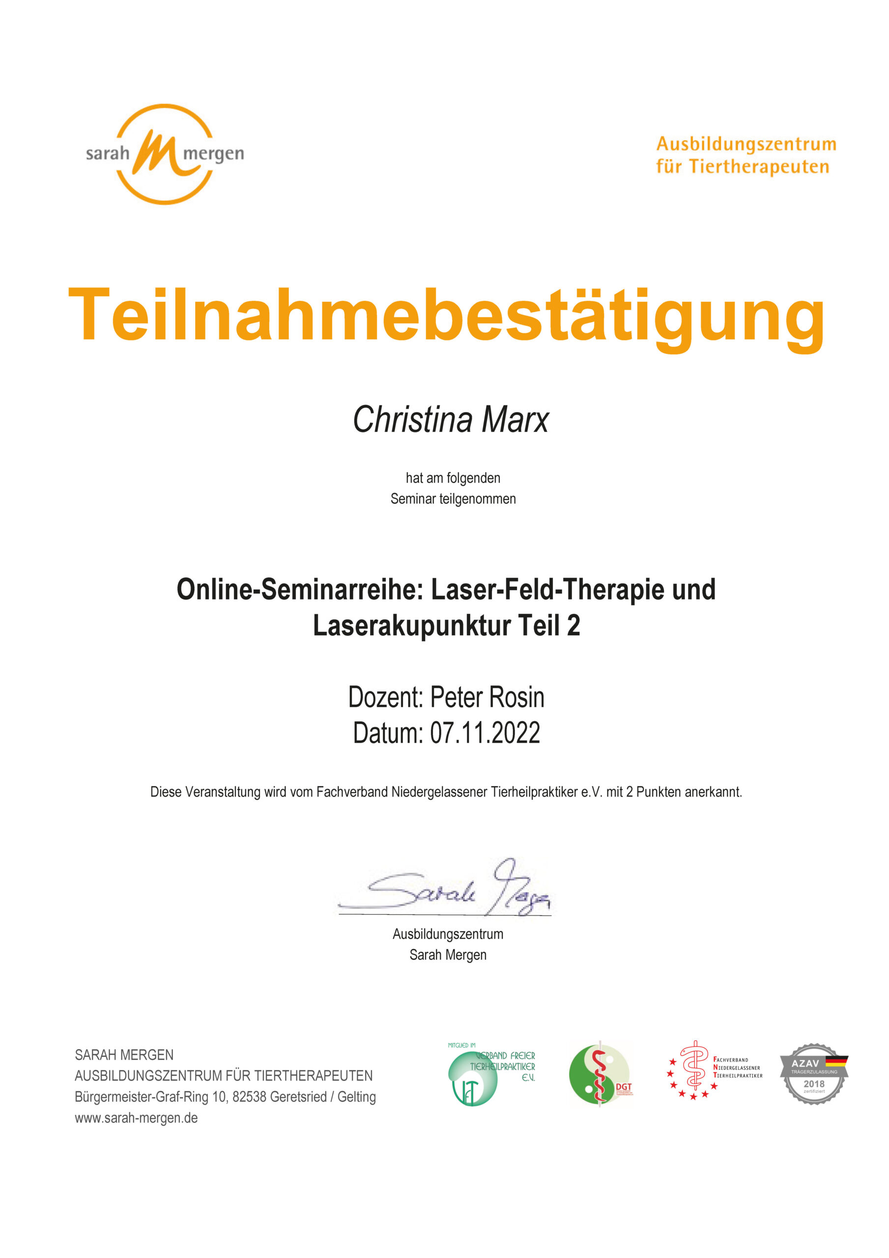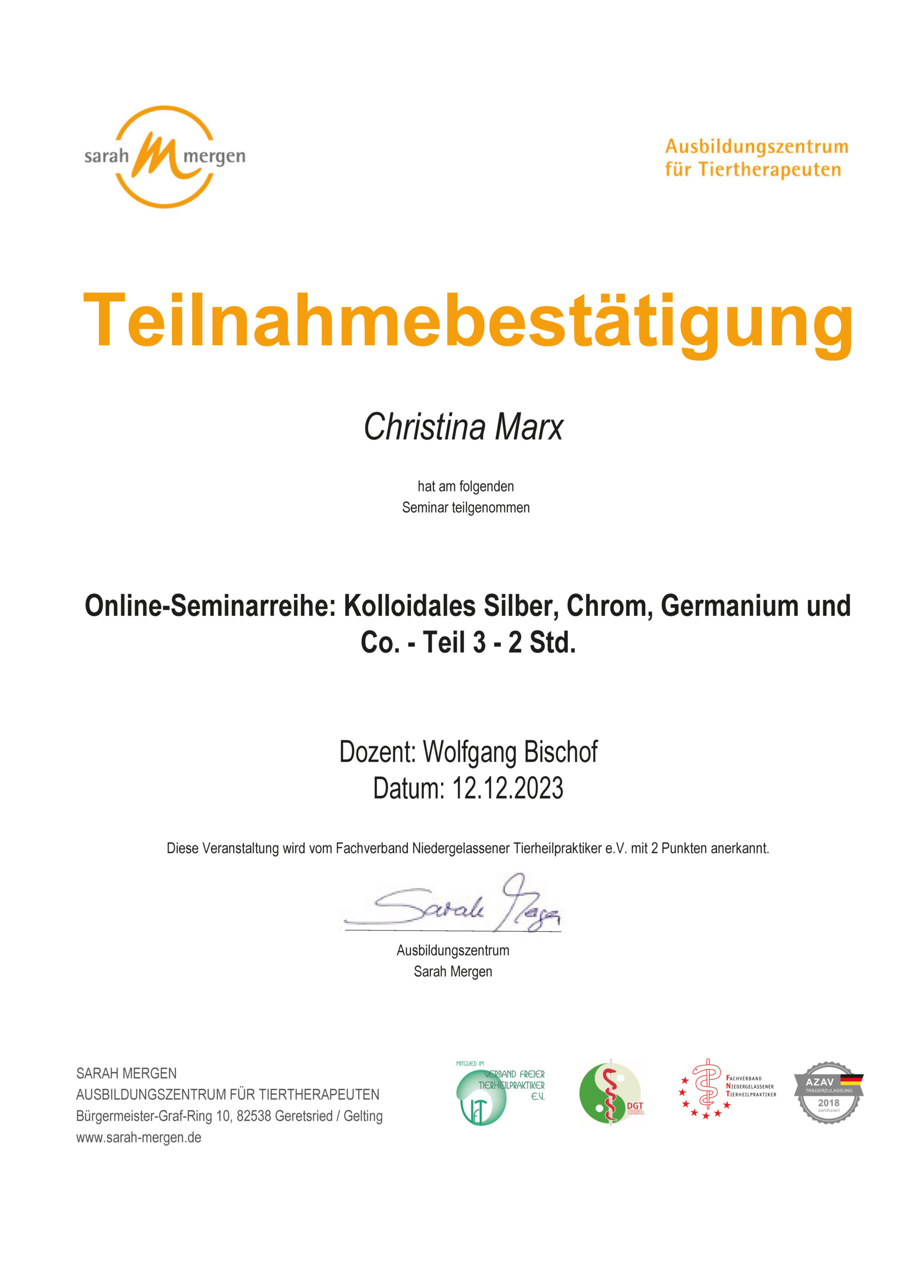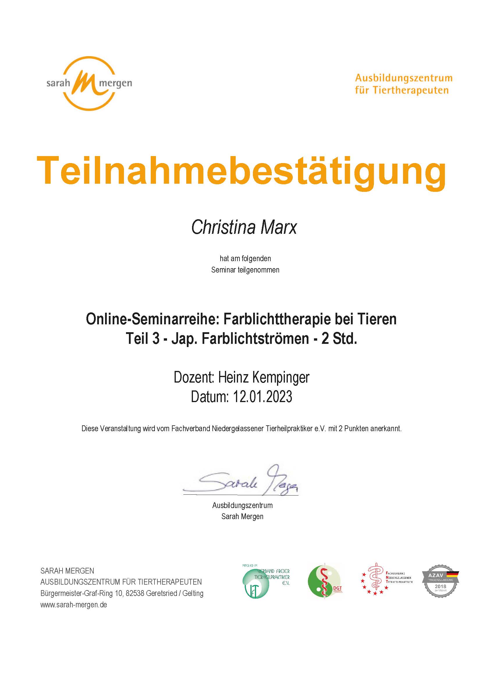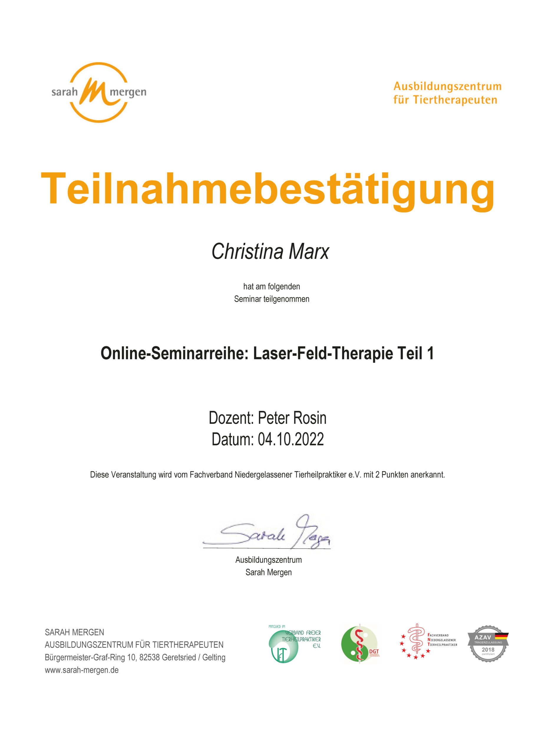Dipl. Tierenergetik, Teilzertifizierung