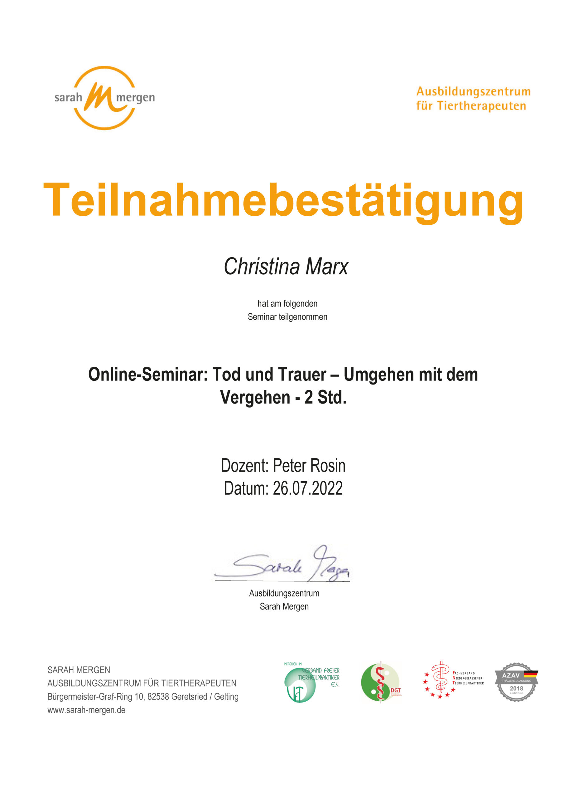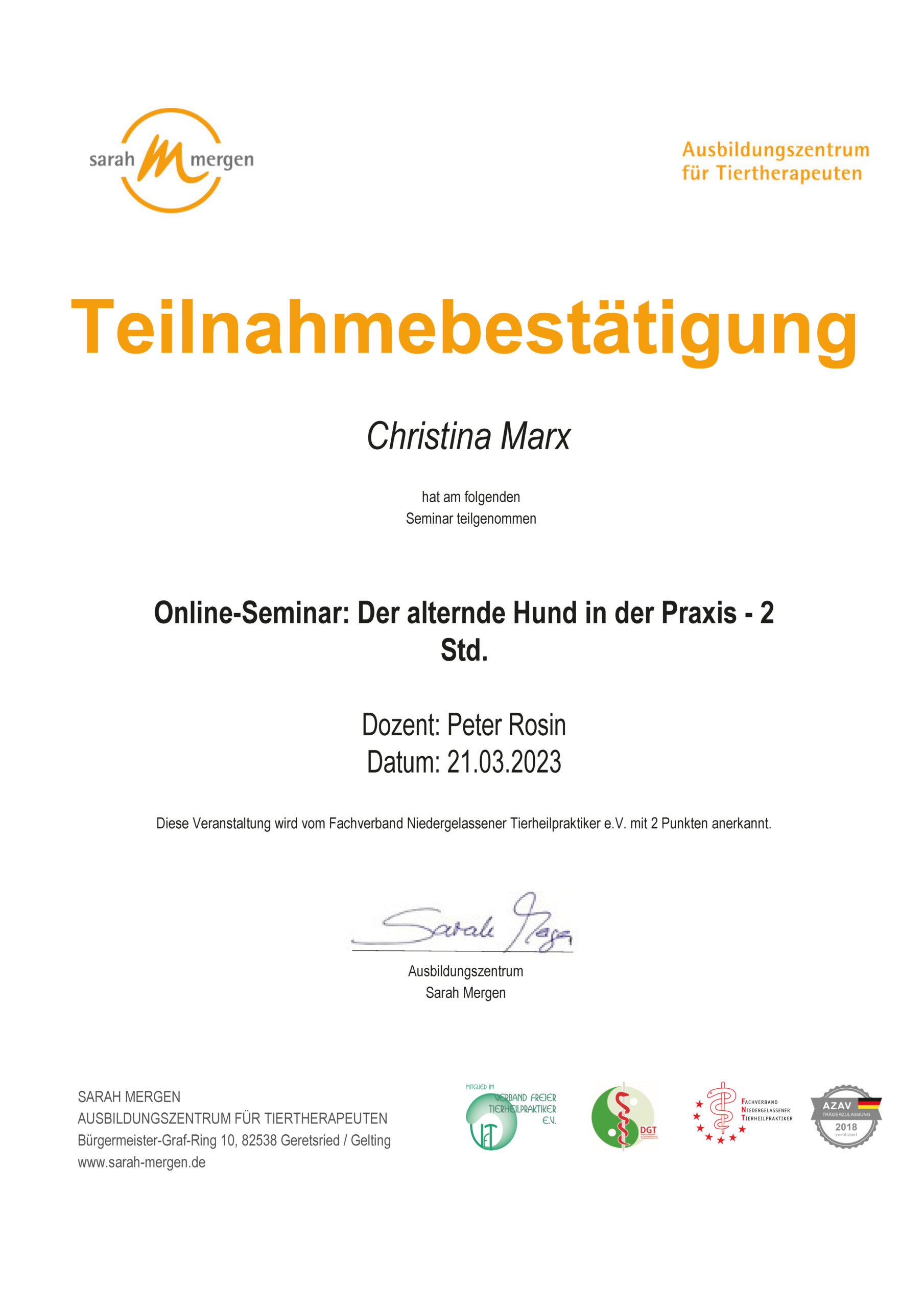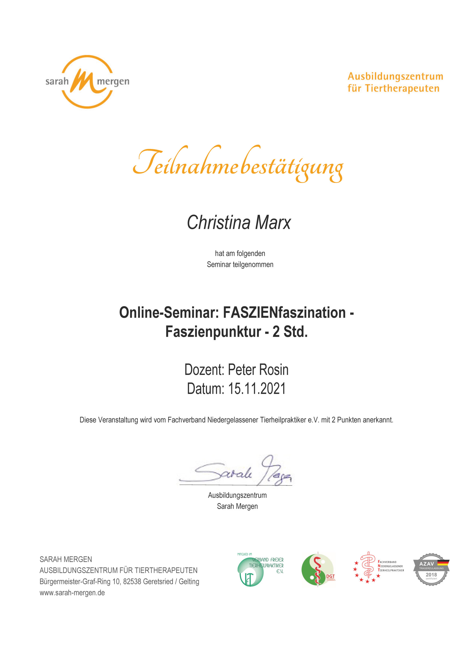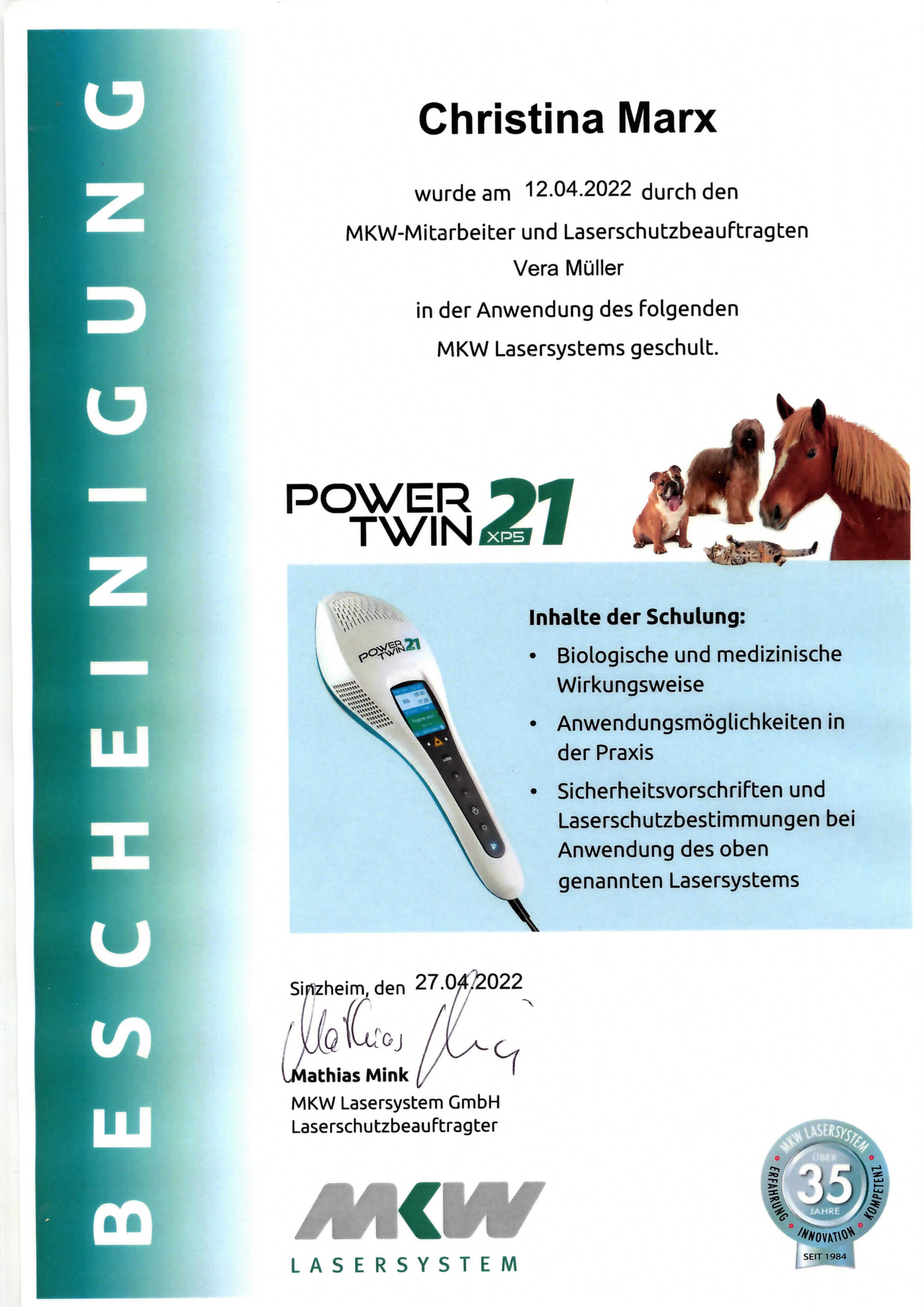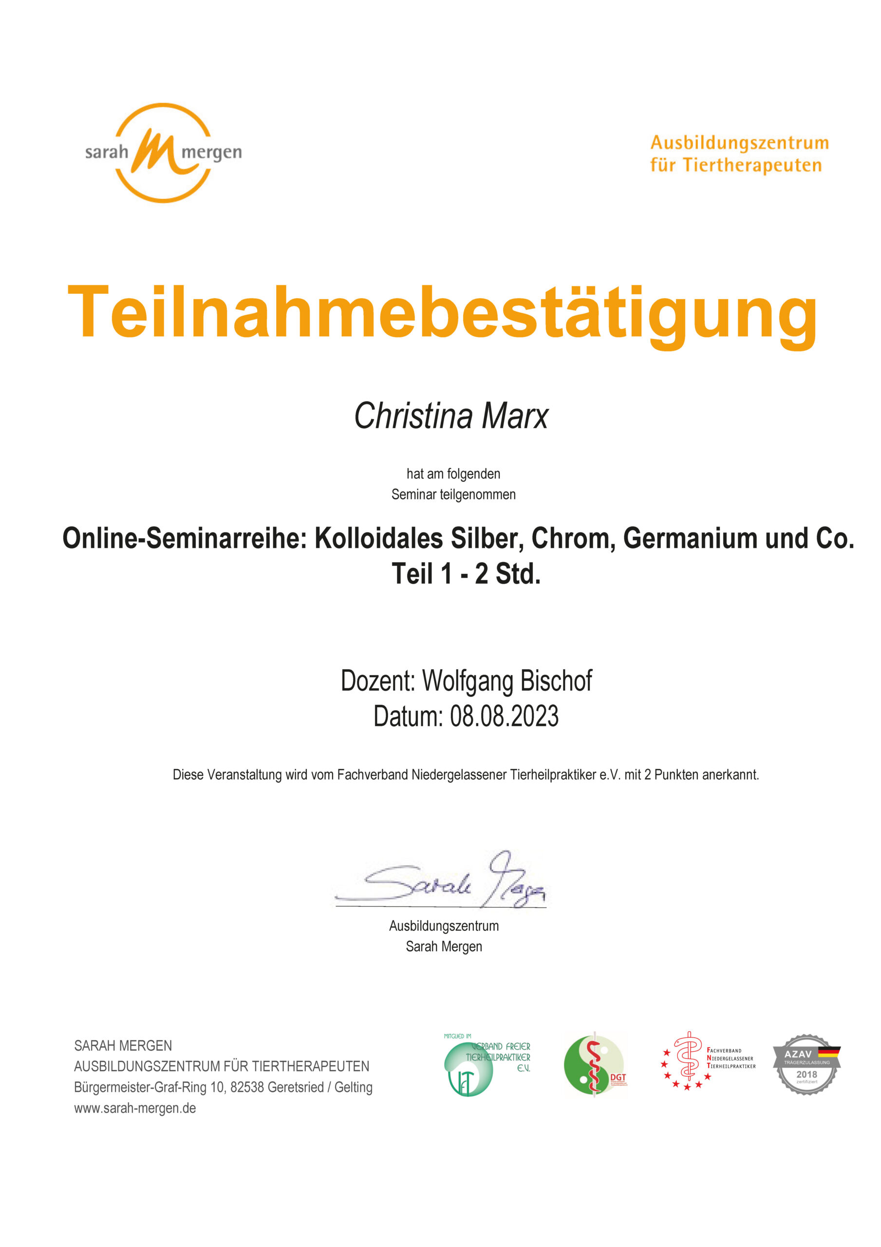 Dipl. Tierenergetik, Teilzertifizierung